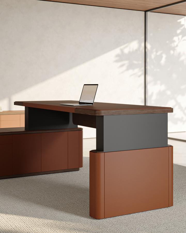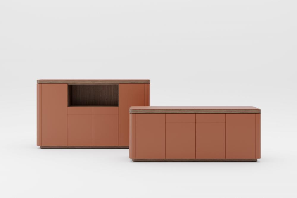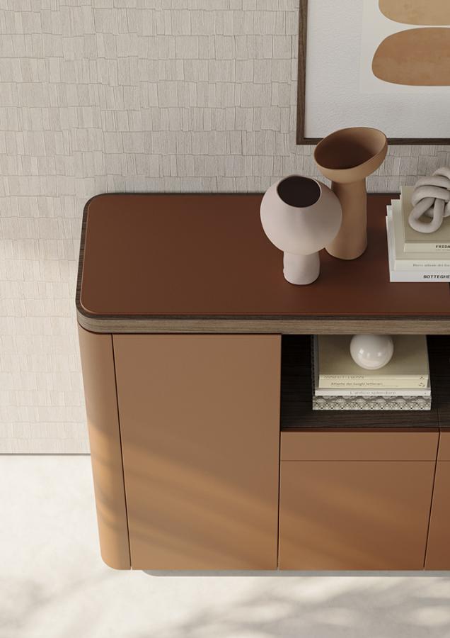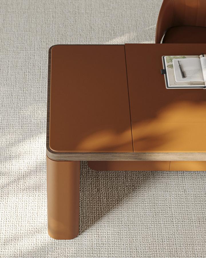 Ses formes simples et proportionnées et l'association raffinée du cuir et du bois créent un meuble intemporel, symbole de style et de prestige.