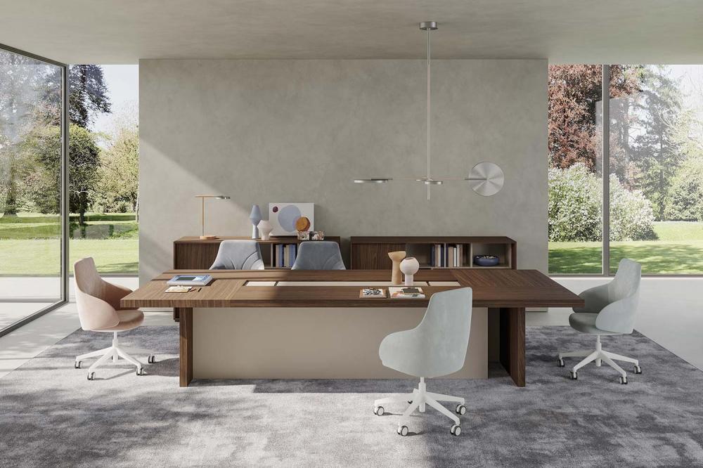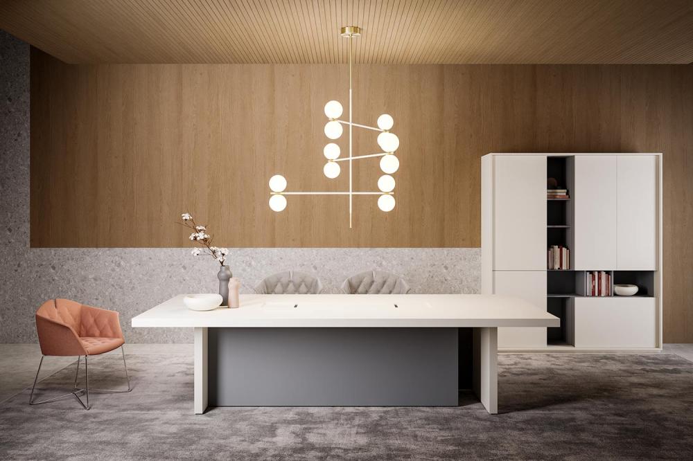 Les tables de réunion de la collection Sessanta combinent une sélection rigoureuse des matériaux pour jouer en harmonie et en alternance dans les surfaces et les volumes du mobilier